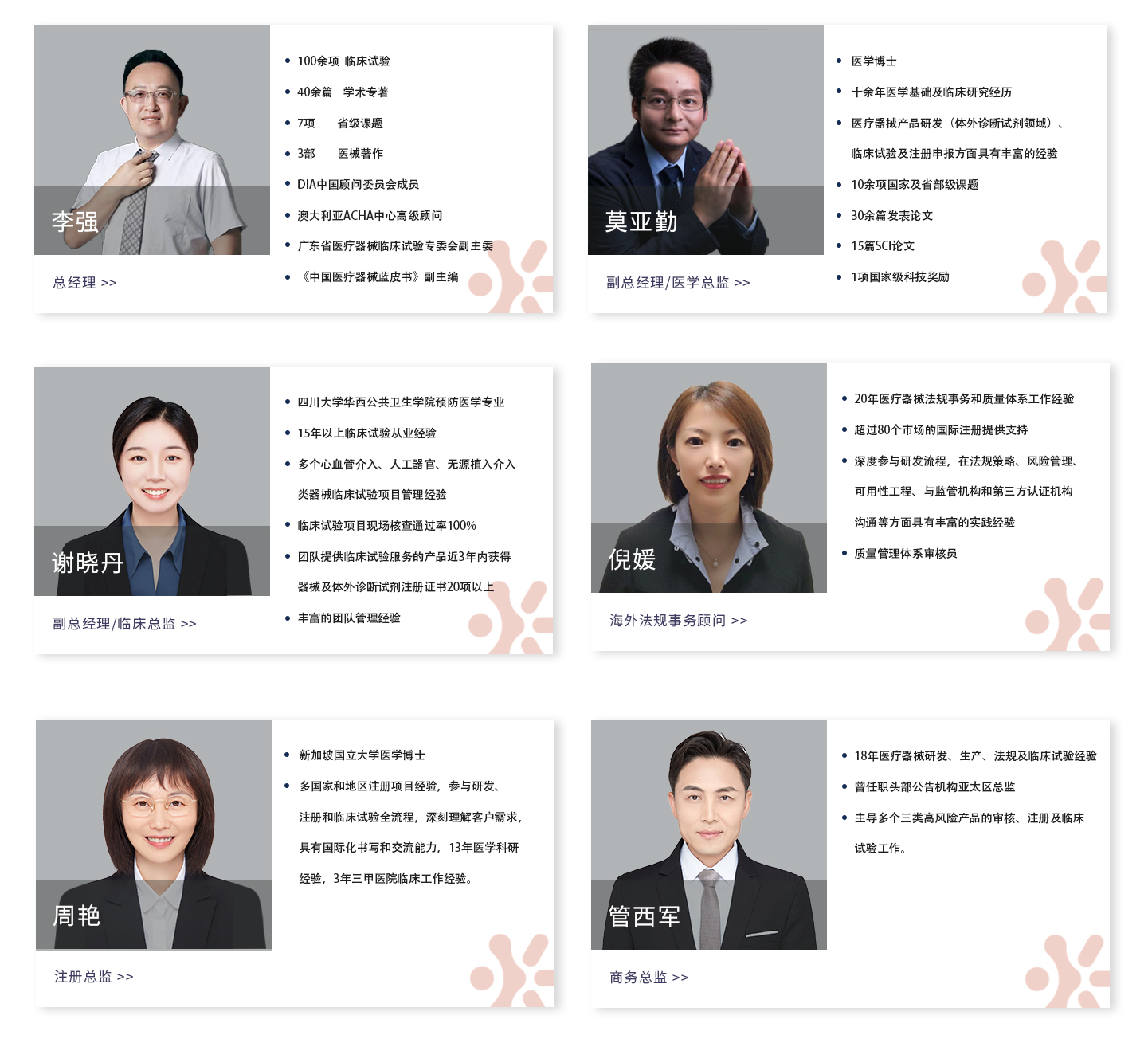 臨床團(tuán)隊(duì):核心臨床團(tuán)隊(duì)人均8年以上醫(yī)療器械臨床項(xiàng)目運(yùn)營經(jīng)驗(yàn)。